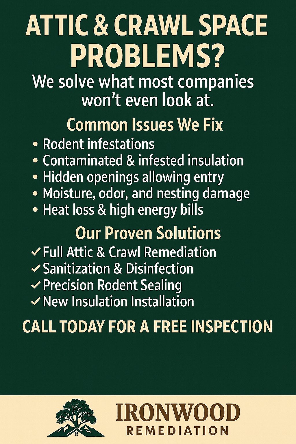 Ironwood Remediation is built around safe removal, decontamination, sealing, and rebuilding — not just trapping.